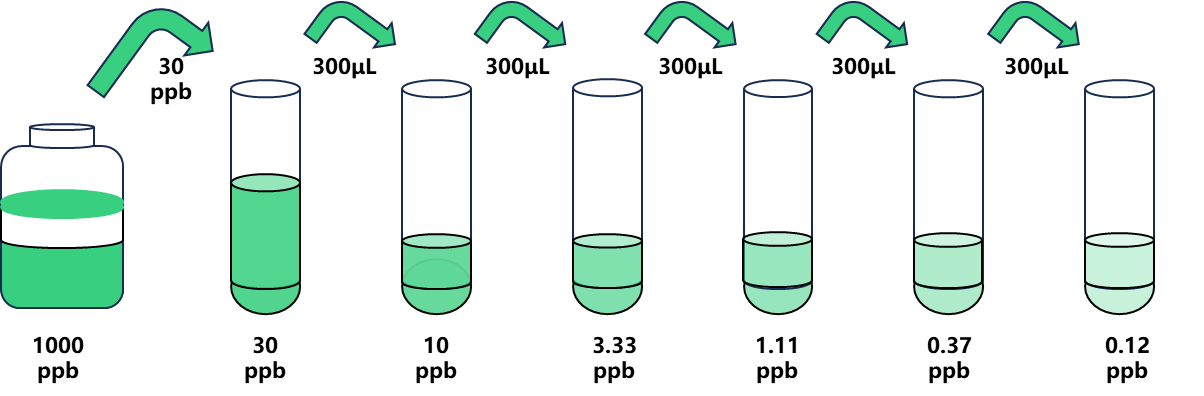 試劑盒中取出標(biāo)準(zhǔn)品,準(zhǔn)備7個(gè)試管,先將1000 ppb標(biāo)準(zhǔn)品(100µL)按需吸取一定量用1×稀釋液稀釋至30 ppb(例:30µL的標(biāo)準(zhǔn)品母液+970µL的1×稀釋液,制備得到1000μL的30 ppb濃度標(biāo)準(zhǔn)品),隨后在5個(gè)試管中分別加入600μL的1×稀釋液,在這5個(gè)單獨(dú)的試管中將30ppb標(biāo)準(zhǔn)品依次3倍倍比稀釋至5個(gè)梯度,共配制6個(gè)濃度的標(biāo)準(zhǔn)品,依次為:30 ppb、10 ppb、3.33 ppb、1.11 ppb、0.37 ppb、0.12 ppb,從最高濃度標(biāo)準(zhǔn)品溶液中吸取300μL標(biāo)準(zhǔn)品到下一個(gè)試管中,輕輕吹打混勻,以此類推進(jìn)行標(biāo)準(zhǔn)品的倍比稀釋(如圖所示),1×稀釋液用作零濃度標(biāo)準(zhǔn)品(0ppb)。